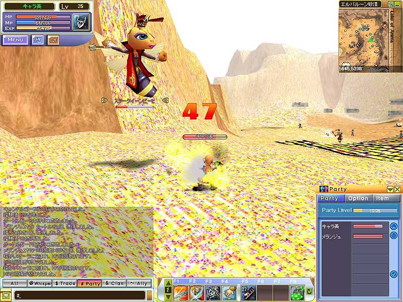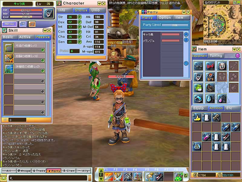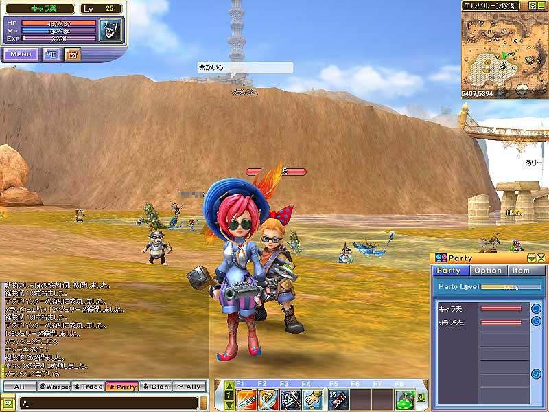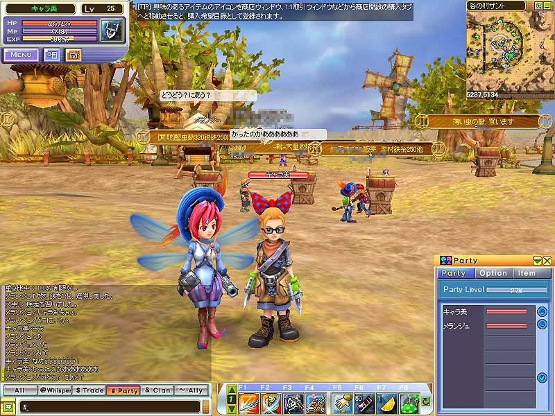 メランジュがログインしてきたので、パーティーを組む。パーティーを組むと敵をたくさん狩れるので、アイテムをモリモリ拾える。店で売ると安いが、バザーを調べて高価で買い取ってくれるひとを見つければ、それなりに儲けることができる。